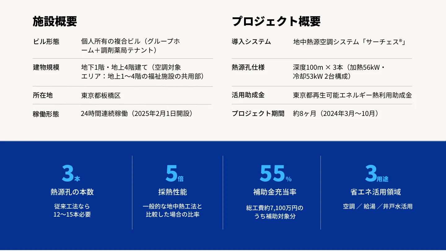 今回ご紹介するのは、東京都板橋区で地域とともに歩んできた塩野様が建築した地下1階・地上4階建ての複合ビル「トックマルット」への導入事例です。ビルの地下1階には調剤薬局(スギ薬局)、地上1~4階にはスターツケアサービス株式会社が運営する「グループホームきらら板橋徳丸 」が入居しており、地中熱源空調システムはこのグループホーム部分で活用されています。