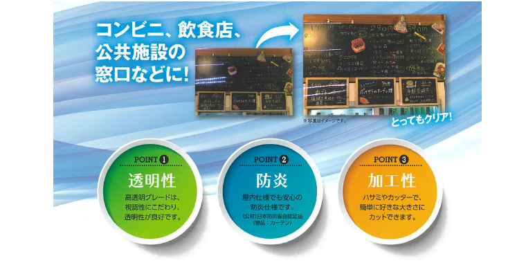タフニール透明の防炎タイプである塩化ビニールシートになります。