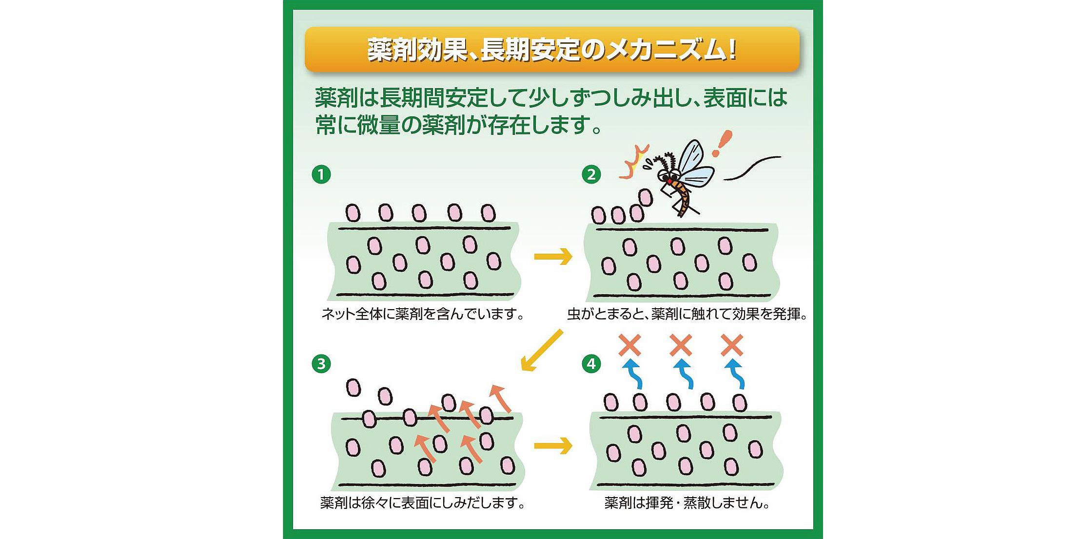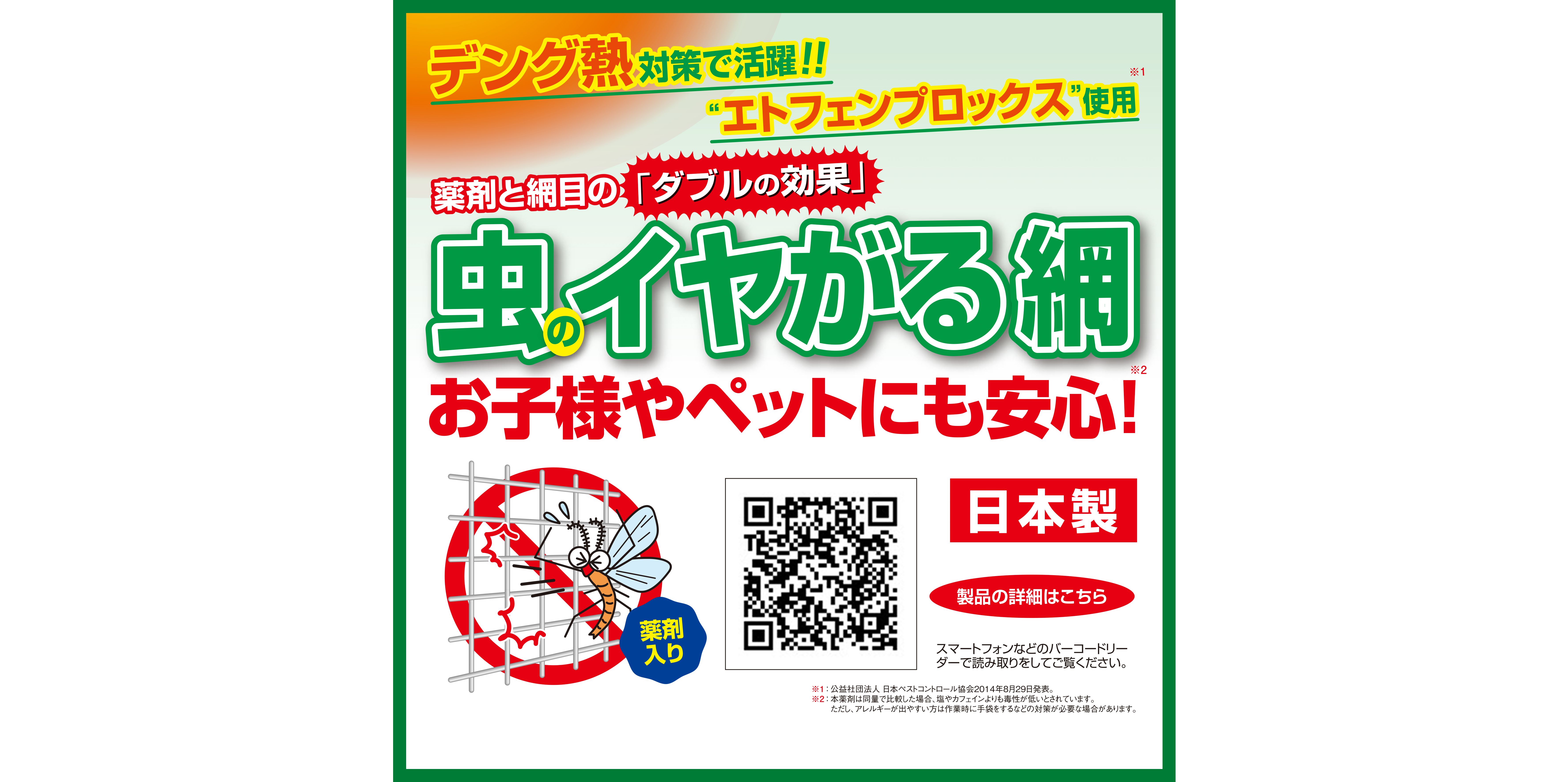 人や動物に安心な「エトフェンプロックス」を使用した虫を遠ざける防虫網。夜間も網戸に虫がとまり続けず、殺虫しないので窓周りも汚れません。