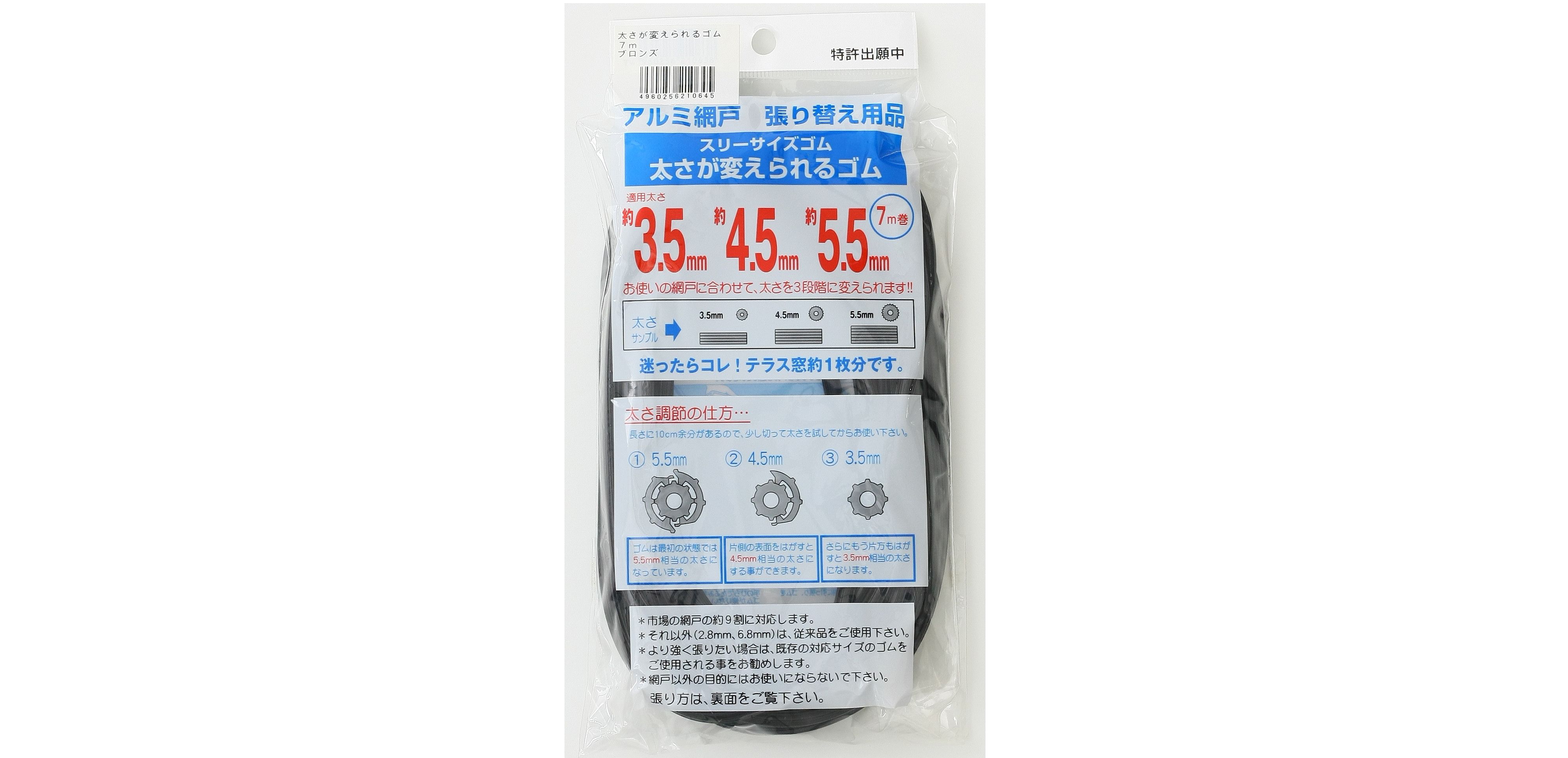 お使いの網戸に合わせて、太さを3.5mm・4.5mm・5.5mmの3段階に変えられる押さえゴムです。