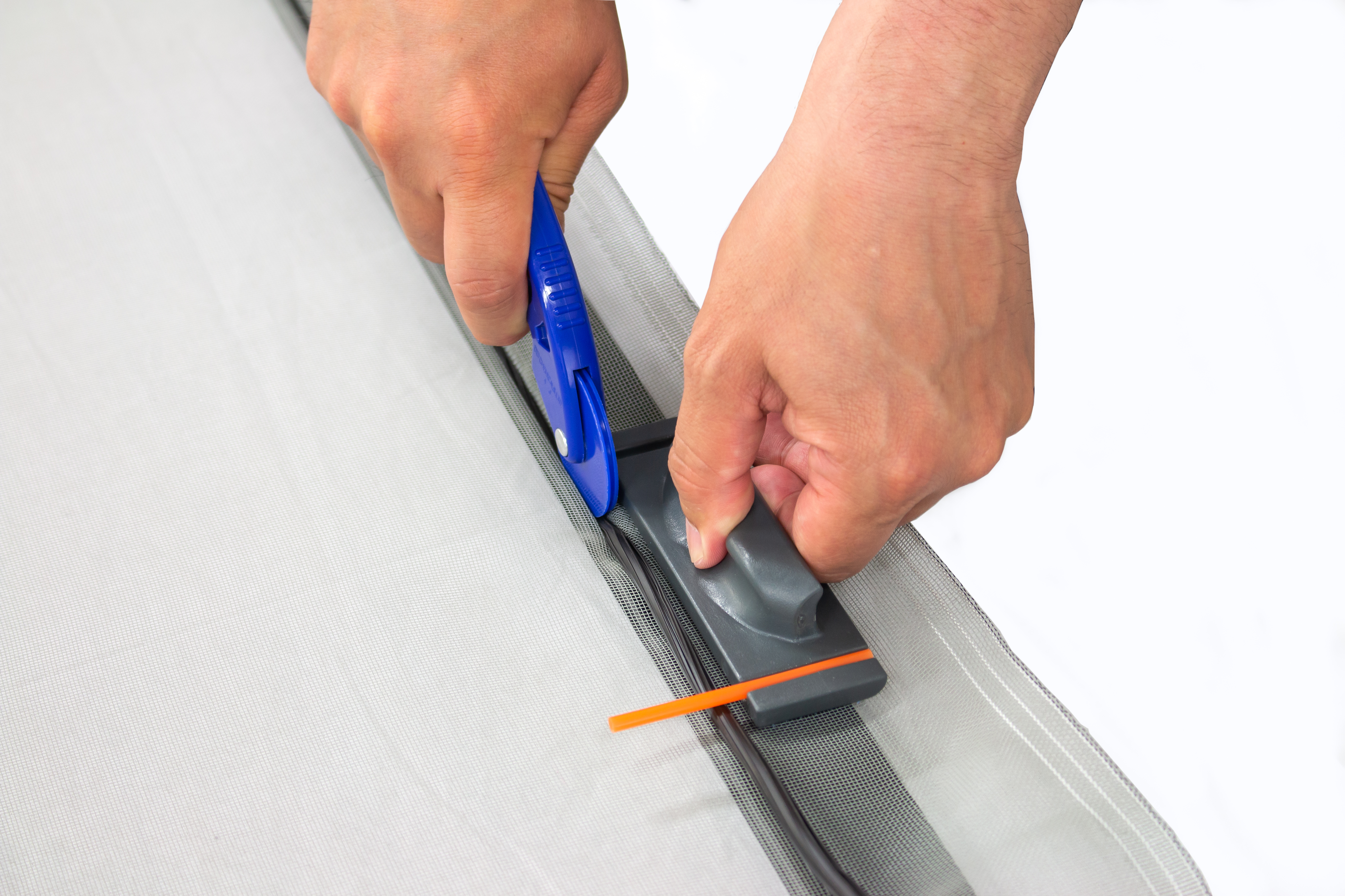 網戸張替作業の後半で手のひらで押さえる代わりに使用し、網戸をピンを張れる便利な道具です。失敗の元になりやすい、ローラーの過度な動きを押さえるストッパー(目安)付き。