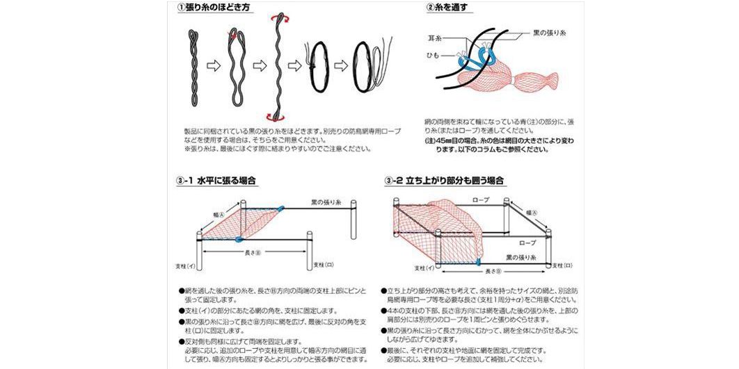 やや目の細かいタイプ の防鳥網。農園芸、車庫、倉庫、工場にも 経済的で手軽な防鳥対策に。