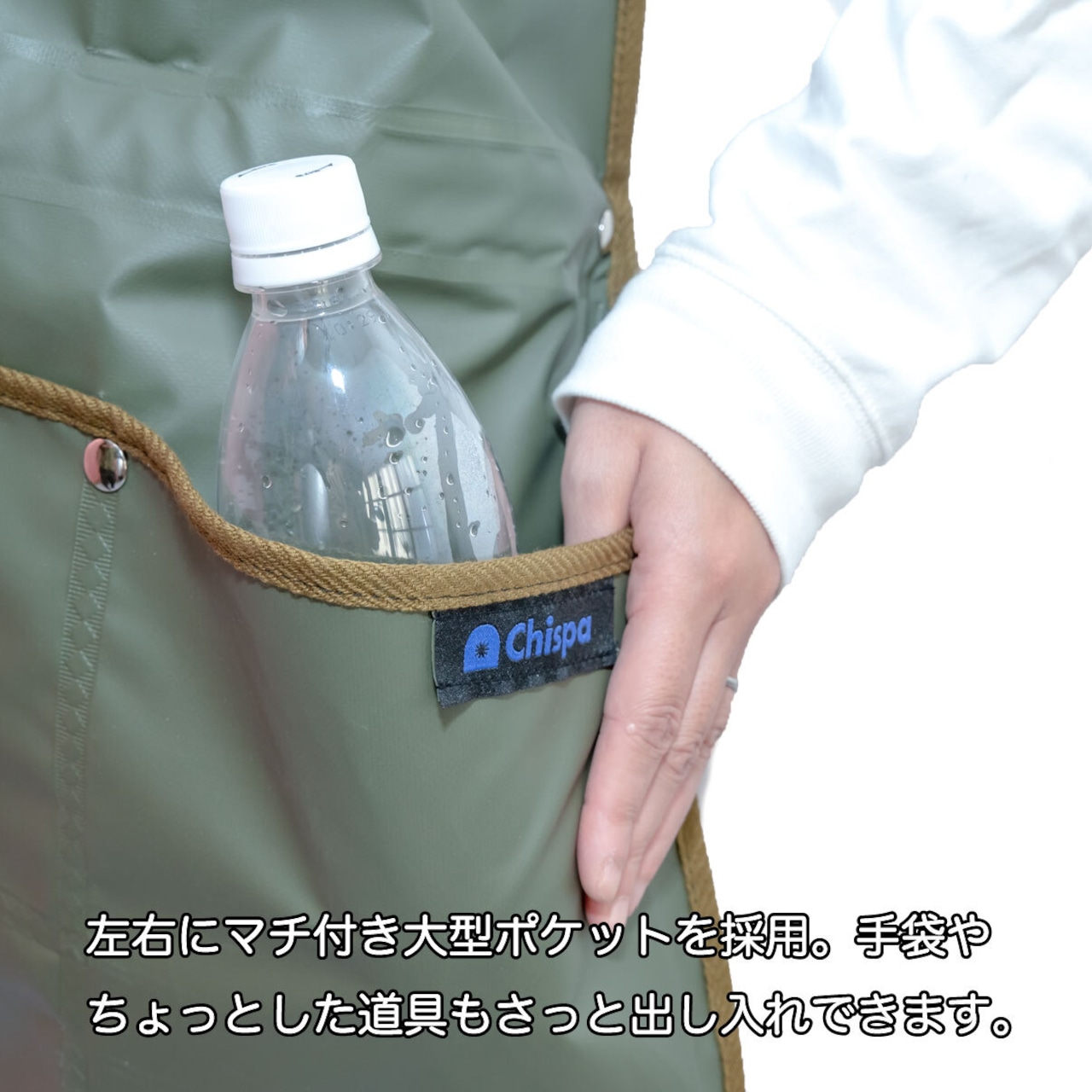 日本製の生地を使用し、職人さんが一枚づつ作り上げた完全防水のポケット付きエプロン