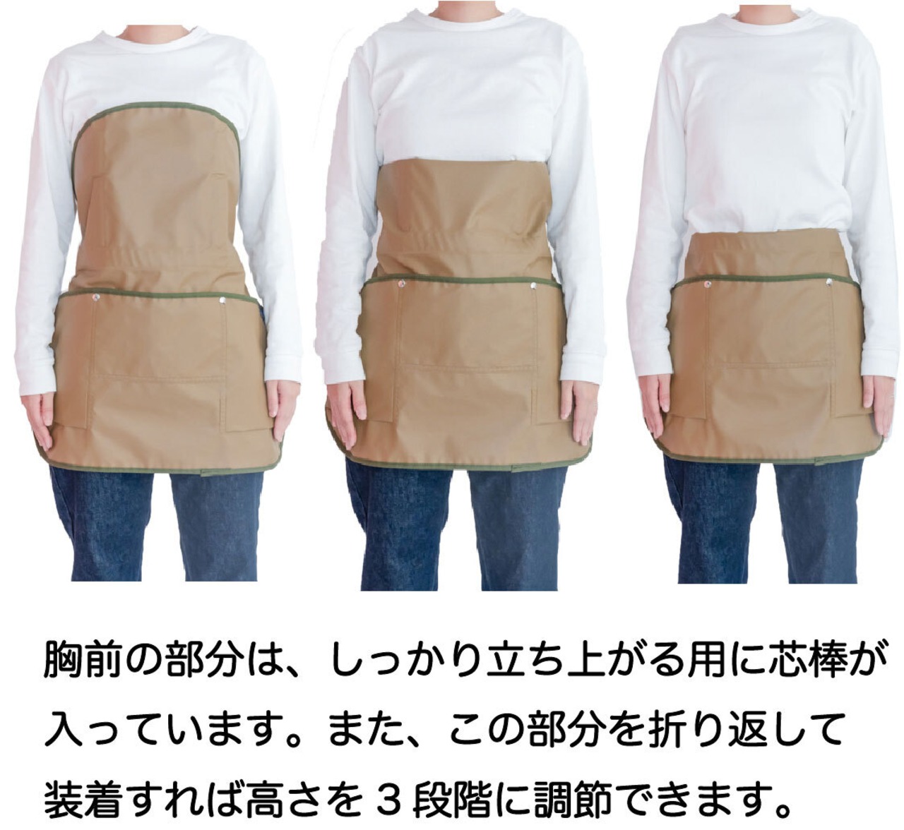 装着はワンタッチでカンタン。芯棒を折り返すと、腰巻きエプロンになる3段階高さ調節可能。ポケット3つ付き