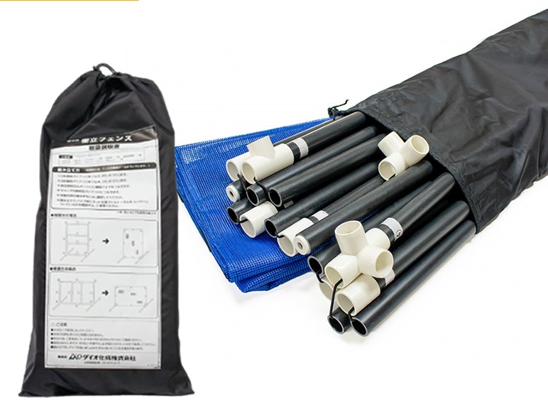 工具不要の組立式で、持ち運びもかんたんな簡易衝立のセットです。現場で組み立て、刈払い作業時の小石悲惨による事故防止や安全対策、通路などの簡易フェンスや雑踏・動線管理、倉庫内での間仕切りや荷物の仕分け時など幅広くお使いいただけます。組み立てはバンジーコードで接続されたパイプを連結し、脚部パイプを取り付けたら面ファスナーでネットを取り付けるだけ。脚部パイプの取付場所を変えると、縦横の向きを変える事ができます。