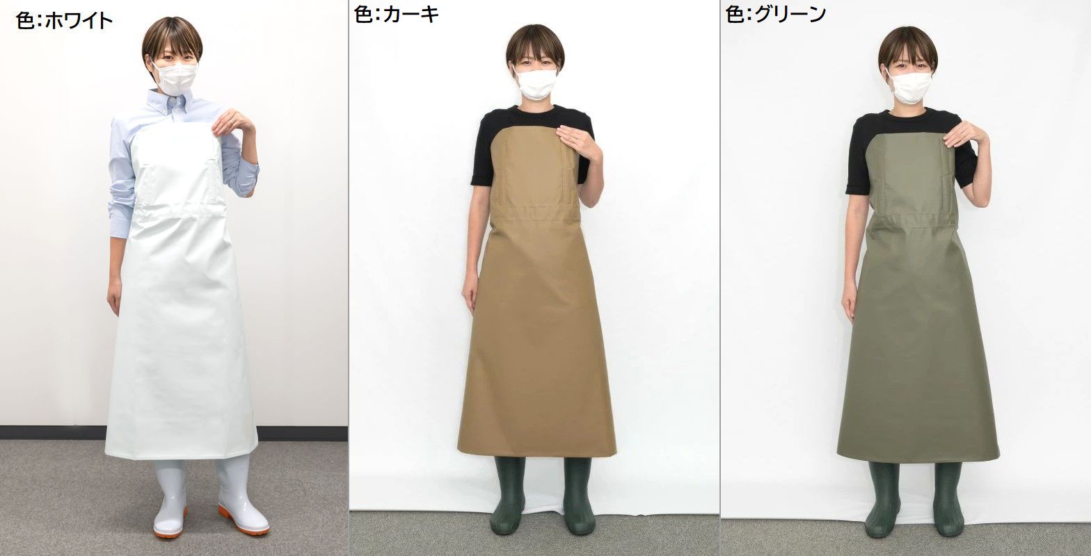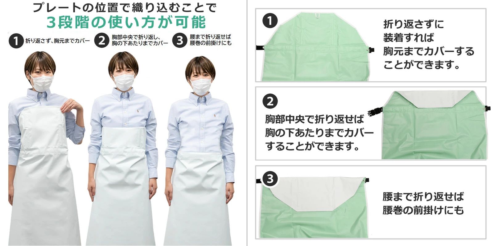 背面のバックルで簡単に装着でき、前面上部にはプレートが挿入されており、肩紐がなくても胸部がしっかり自立するエプロンです。また、このプレート複数枚に分割されているので、折りたたむことにより、上半身では、胸もとまでカバー、胸の下あたりまでカバー、腰巻の前掛けスタイルという3Wayの使い方が可能な防水エプロンです。色展開は、基本となる「白」に加え、さまざまな場面に適合する「カーキ」、「グリーン」の3色をご用意しております(サイズは、白のみMとL、その他は、Mのご用意となります)。